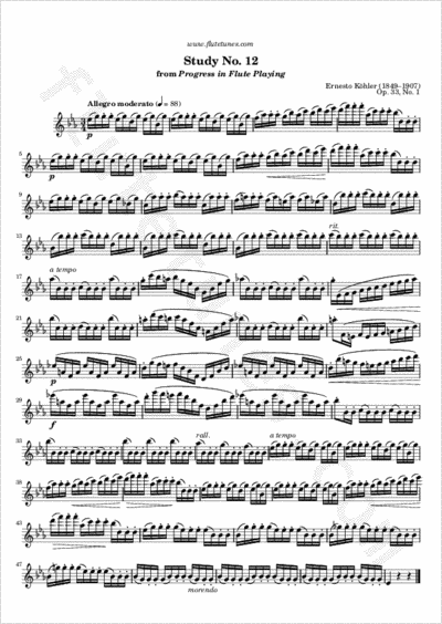 This is étude No. 12 from the first book of Ernesto Köhler's Progress in Flute Playing, Op. 33. It mostly consists of sixteenth notes; make sure to play every note clearly, and pay close attention to articulation.