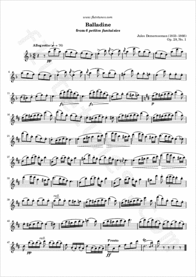 This “little ballade” is the first of 6 easy fantaisies published as Op. 28 by French Romantic flutist Jules Demersseman. The piece features a rather plaintive introduction in D minor, but after 14 measures it shifts to D major, and stays in that key till the end.