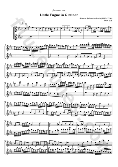 The “Little” G minor's four-and-a-half-measure subject is one of Bach's most widely recognized tunes. During the episodes, Bach employs one of Arcangelo Corelli's most beloved sequential gestures: imitation between two voices on an eighth note upbeat figure that first leaps up a fourth and then falls back down one step at a time.