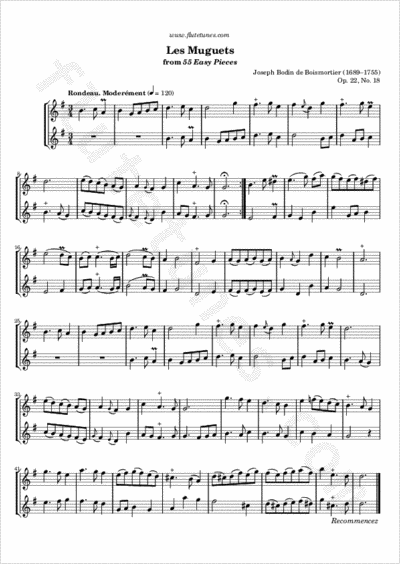 This is the fourth duet in G major from the 55 Easy Pieces collection by Baroque composer Joseph Bodin de Boismortier. “Les Muguets” is French for “The Lilies of the Valley”.
