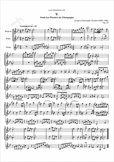 This is the fifth movement of French composer Jacques-Christophe Naudot's Suite en trio “Les plaisirs de Champigny”, Op. 18. The piece was originally written for musette (a baroque-era instrument similar to a bagpipe), flute and violin, but it can be played as is by two flutes and a violin, or with very little modification (the little notes in the violin part) by three modern flutes.