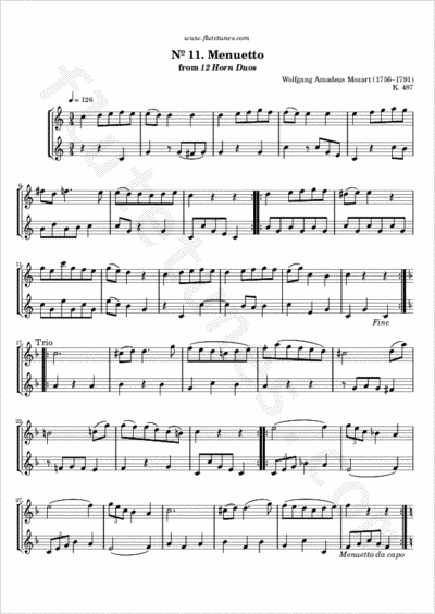 This minuet is the eleventh of Mozart's Twelve Duos for Horn, K. 487, which he composed in Vienna in 1786. They were probably intended for the basset horn, a wind instrument similar to the clarinet, but larger, in F (less often in G), and with a darker sound.