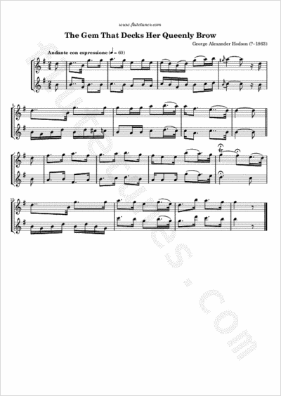 The present arrangement for two flutes of George Alexander Hodson's song “The Gem That Decks Her Queenly Brow” is taken from Blake's Young Flutist's Magazine, published in 1833.