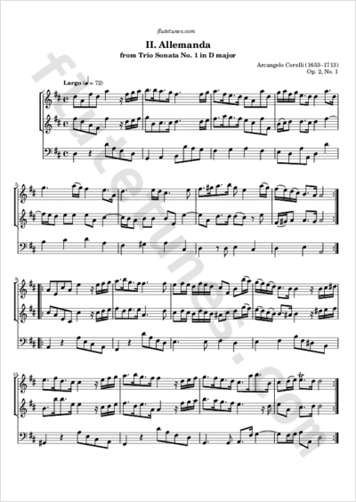 This allemande is the second movement of Italian Baroque composer Arcangelo Corelli's Trio Sonata No. 1 in D major, published in 1685. Corelli was a violinist, and this sonata was originally scored for two violins and continuo; however, it can be played without issues by two flutes.