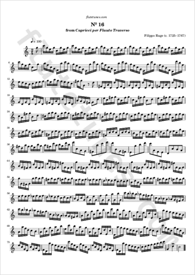This is the sixteenth piece from a collection of 17 Capricci for Flauto Traverso by Italian flutist and composer Filippo Ruge. Born in Rome around 1725, Ruge appears to have spent most of his professional life in France, and especially in Paris, where several of his compositions were published, ranging from small-scale chamber music to large-scale symphonic works.