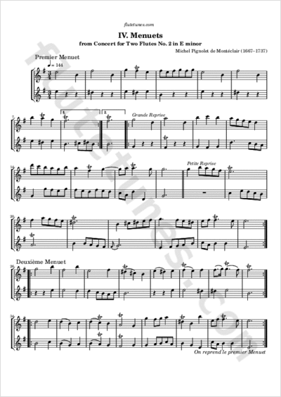 These two minuets constitute the fourth movement of the second of six Concerts à deux Flutes Traversières sans Basse by the French Baroque composer Michel Pignolet de Montéclair. Here the French word concert is a synonym of “suite”, and has nothing to do with the Italian concerto. The first minuet features a petite reprise, a small section that is to be repeated (usually with added ornamentation) at the very end of the piece. The overall structure of the movement is therefore AABCBCDDEEABCC'.