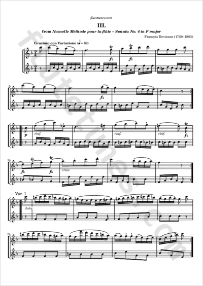 This Grazioso and its accompanying variations constitute the third and final movement of the fourth Sonata for two flutes included in the Nouvelle Méthode théorique et pratique pour la flûte by French flutist and composer François Devienne.