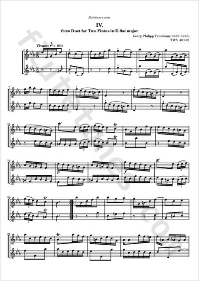 This Vivace is the fourth and final movement of a flute duet in E-flat major by the prolific Baroque composer Georg Philipp Telemann. It was first published by Telemann himself in 1727 as part of a collection of 6 flute duets, TWV 40:130-135.