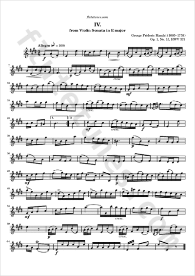 This Allegro is the fourth and final movement of a sonata for violin and basso continuo in E major, HWV 373, first published in 1730. It was originally thought to have been composed by George Frideric Handel, but modern scholars consider this doubtful, and have labelled it as “spurious”.