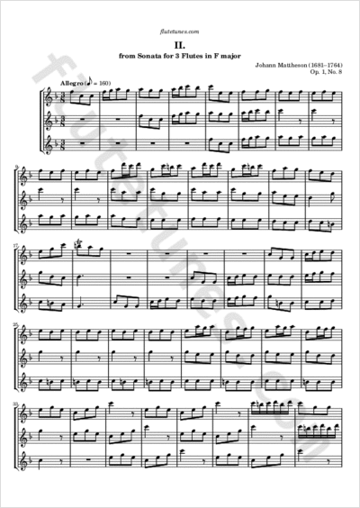 This Allegro is the second movement of a sonata for 3 flutes in F major by the German Baroque composer and music theorist Johann Mattheson. It was published in Amsterdam in 1708.